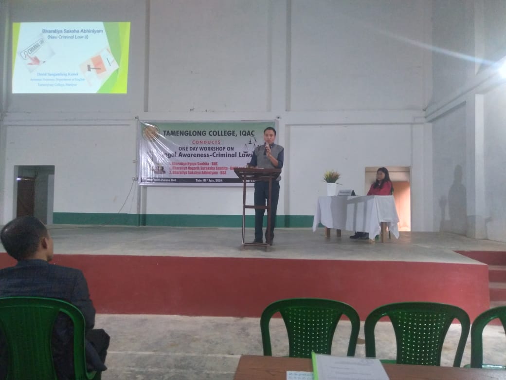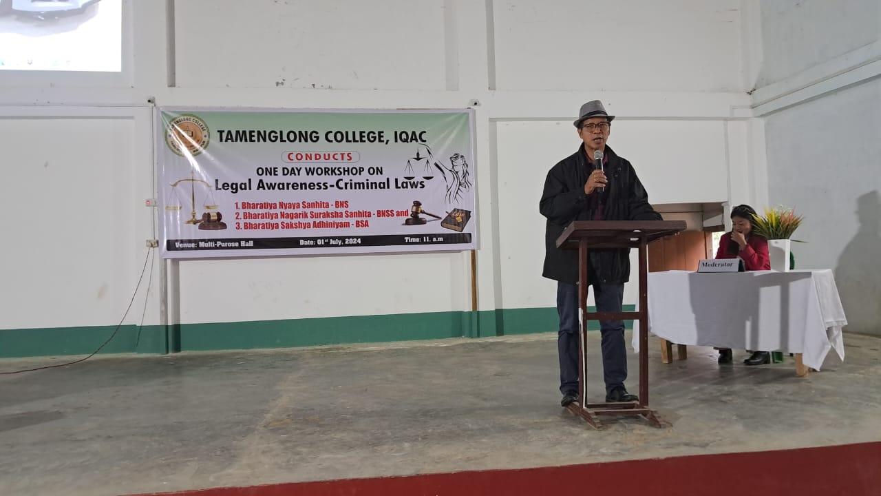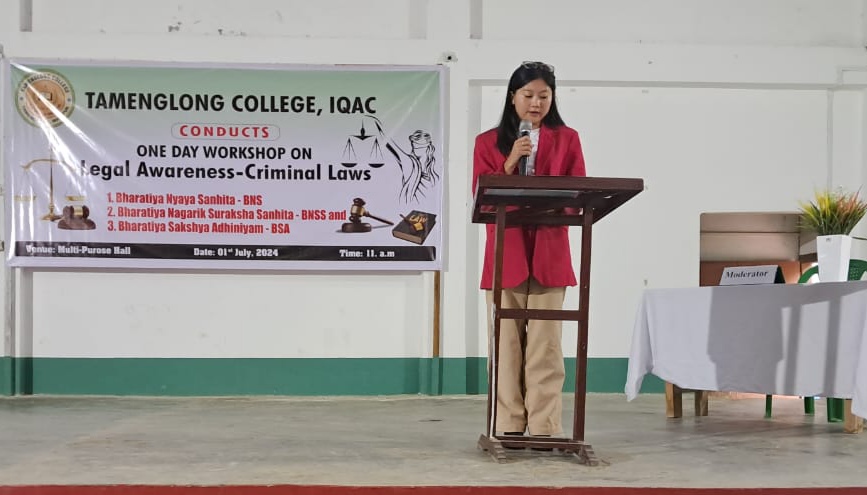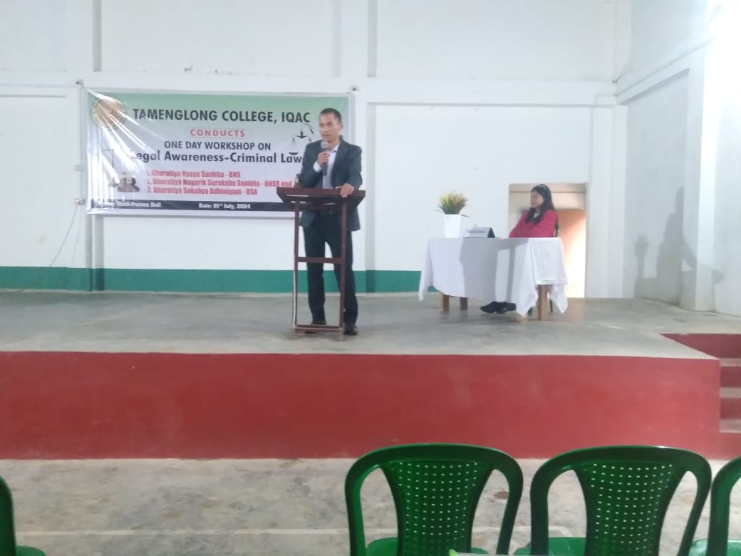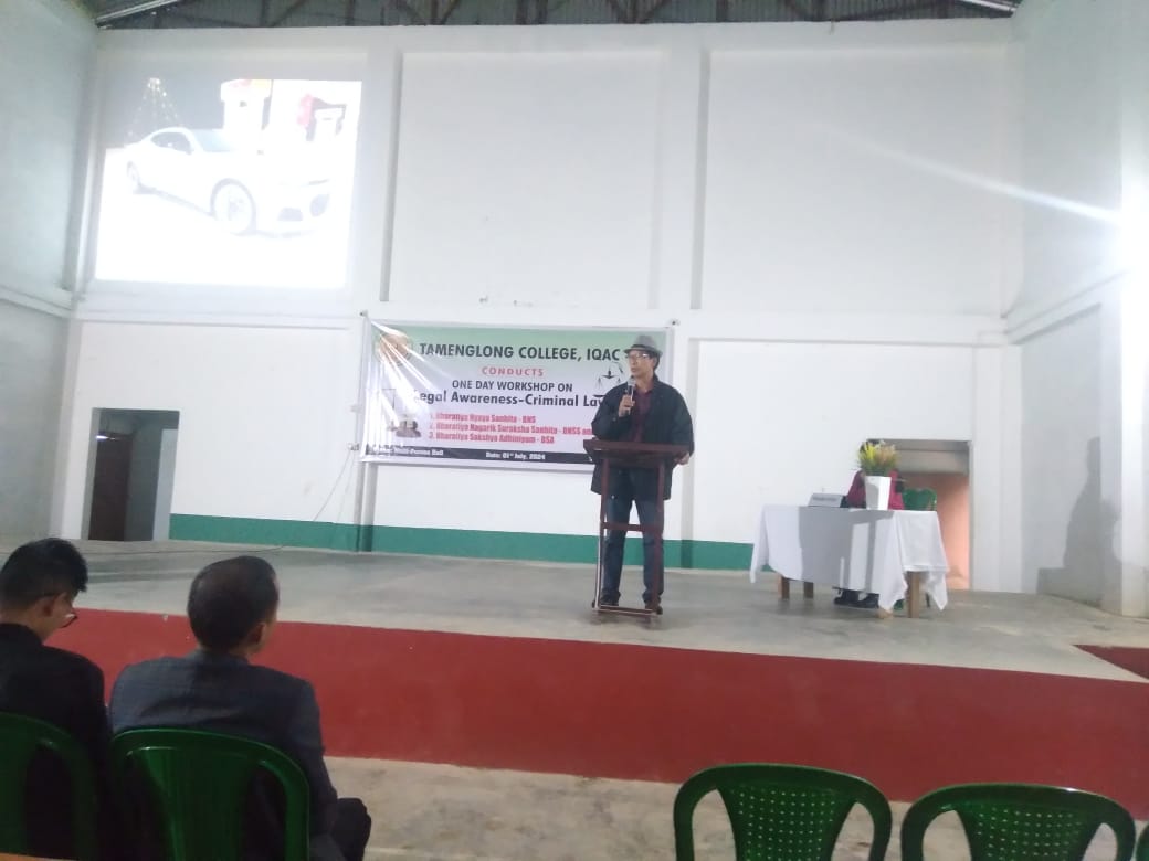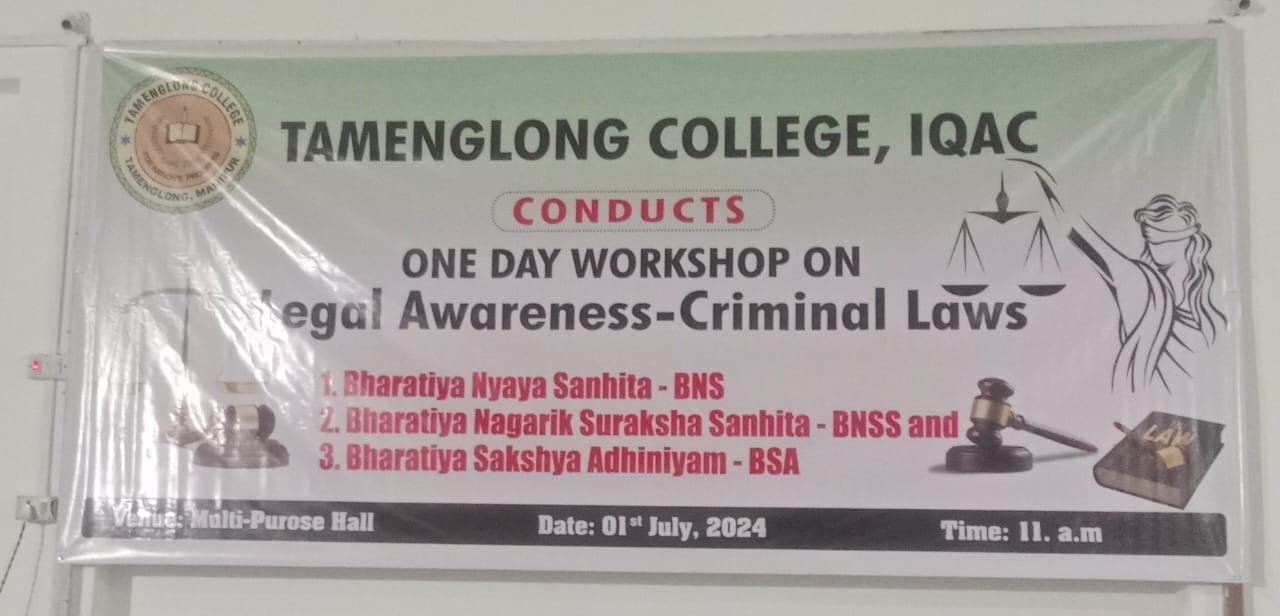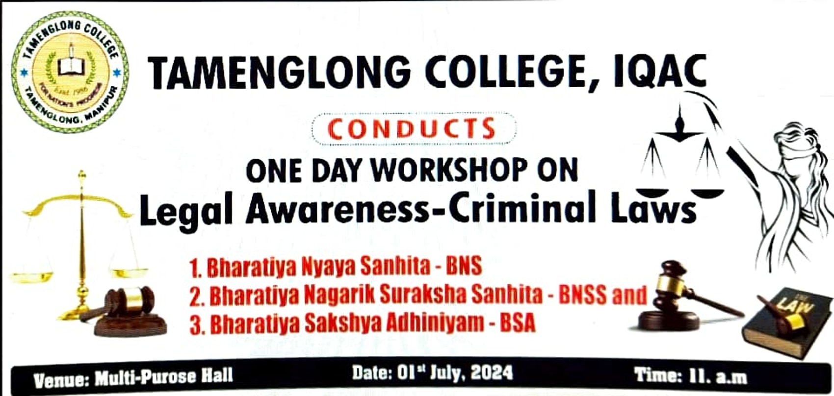 The Internal Quality Assurance Cell (IQAC), Tamenglong College, conducted a one day Workshop on Legal Awareness on the new three Criminal Laws on 1st July, 2024. The workshop began with opening remark from the Principal of the college, Dr. Kinthuijinang Maremmei, and was followed by a thorough deliberation on the new three laws, namely Bharatiya Nyaya Sanhita, Bharatiya Nagarik Suraksha Sanhita and Bharatiya Sakshya Adhiniyam, by Shri