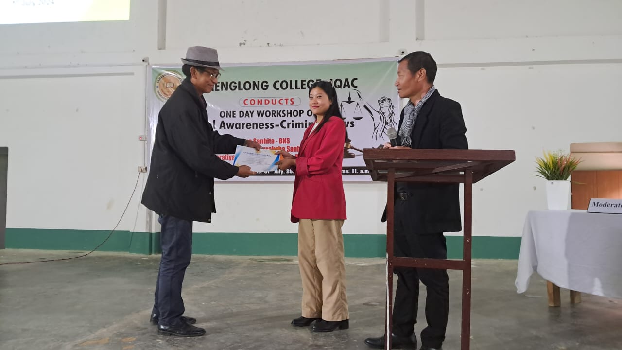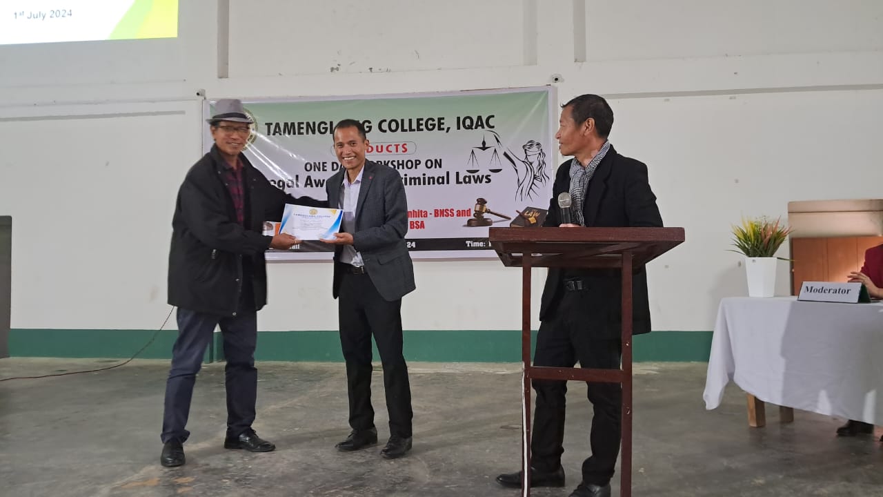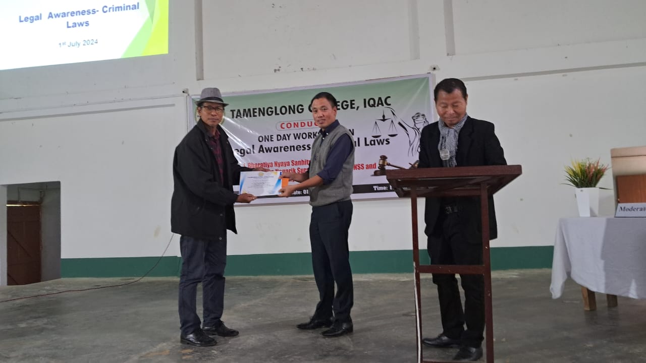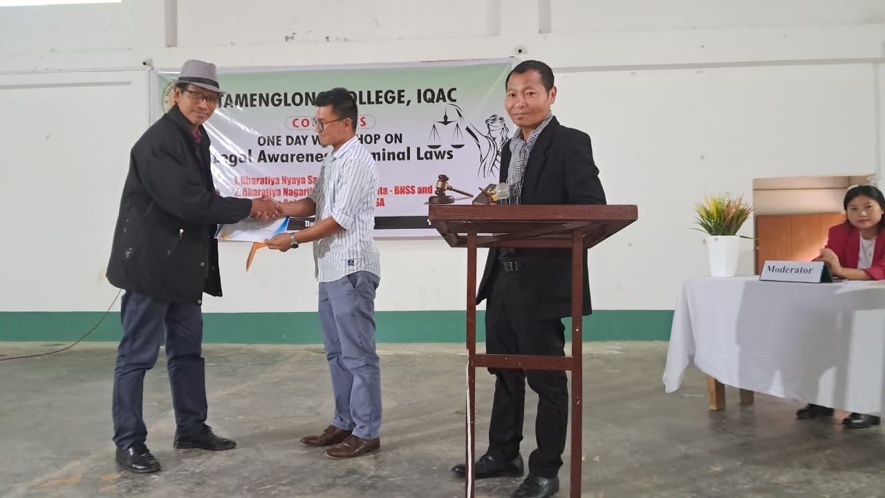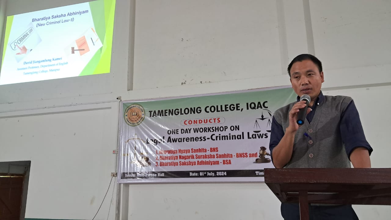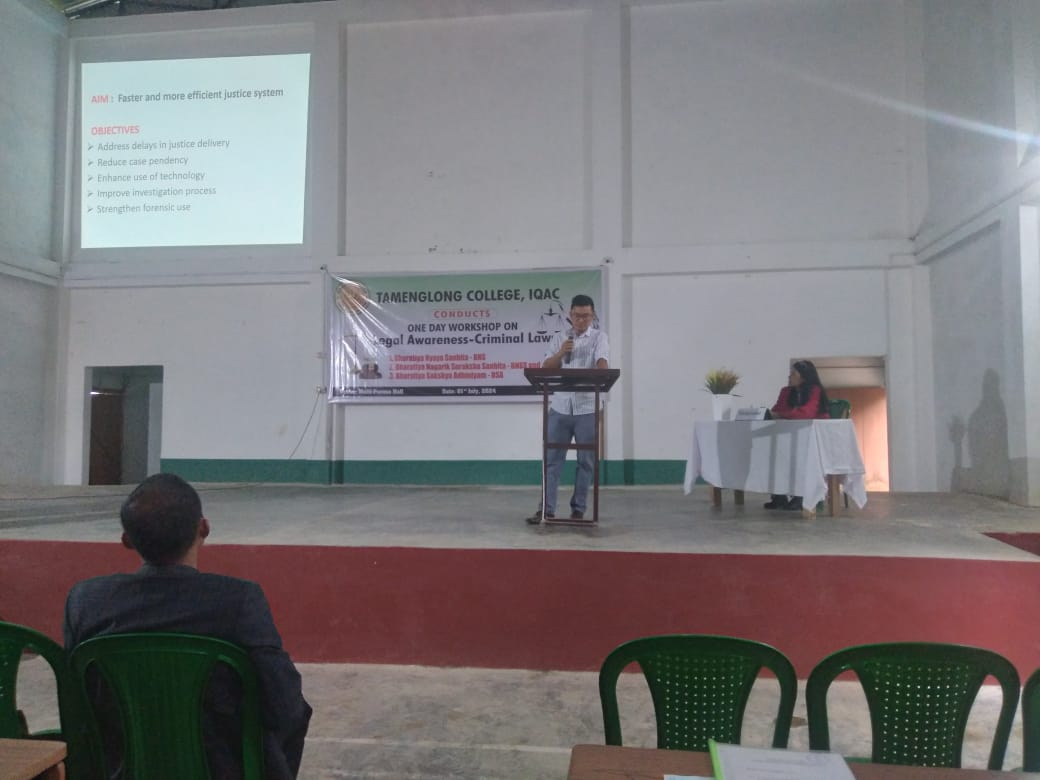 The Internal Quality Assurance Cell (IQAC), Tamenglong College, conducted a one day Workshop on Legal Awareness on the new three Criminal Laws on 1st July, 2024. The workshop began with opening remark from the Principal of the college, Dr. Kinthuijinang Maremmei, and was followed by a thorough deliberation on the new three laws, namely Bharatiya Nyaya Sanhita, Bharatiya Nagarik Suraksha Sanhita and Bharatiya Sakshya Adhiniyam, by Shri