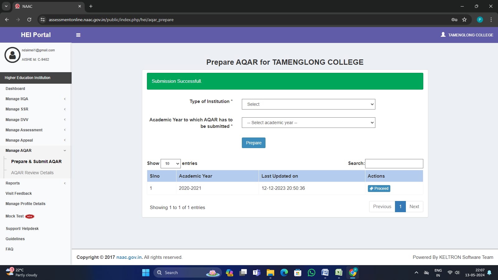 Finally, the AQAR for 2022-23 was successfully submitted to the official portal of NAAC on 13 May 2024. It is the fruit of days of hard work and support from all the stakeholders, including the Principal, staff, students, alumni, and the local community. The IQAC team, therefore, expressed its heartfelt gratitude to one and all.