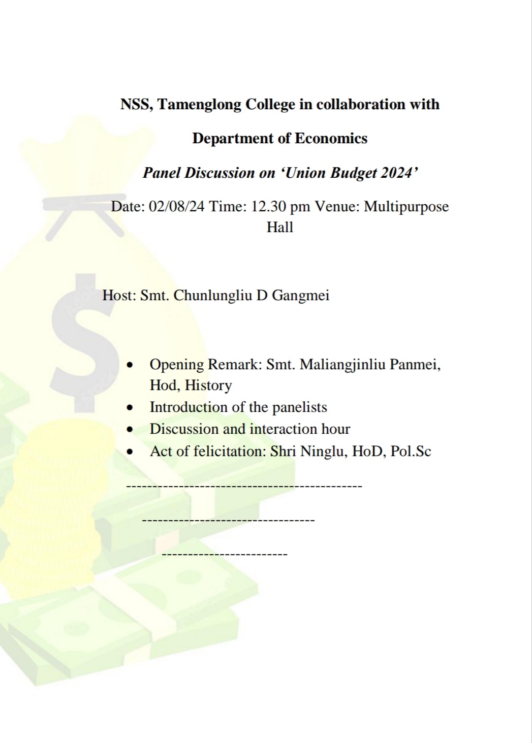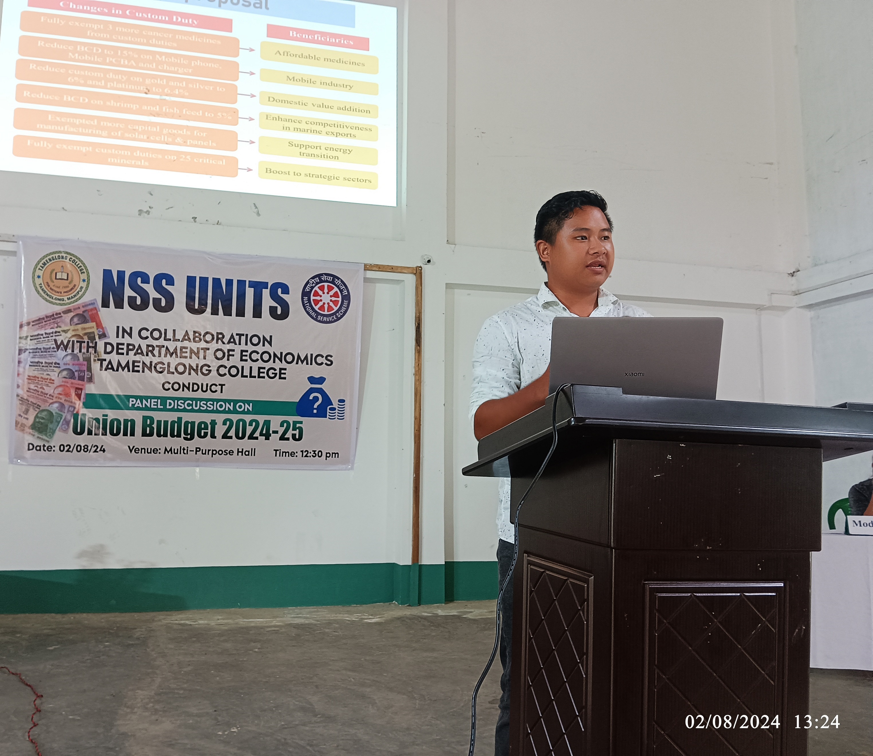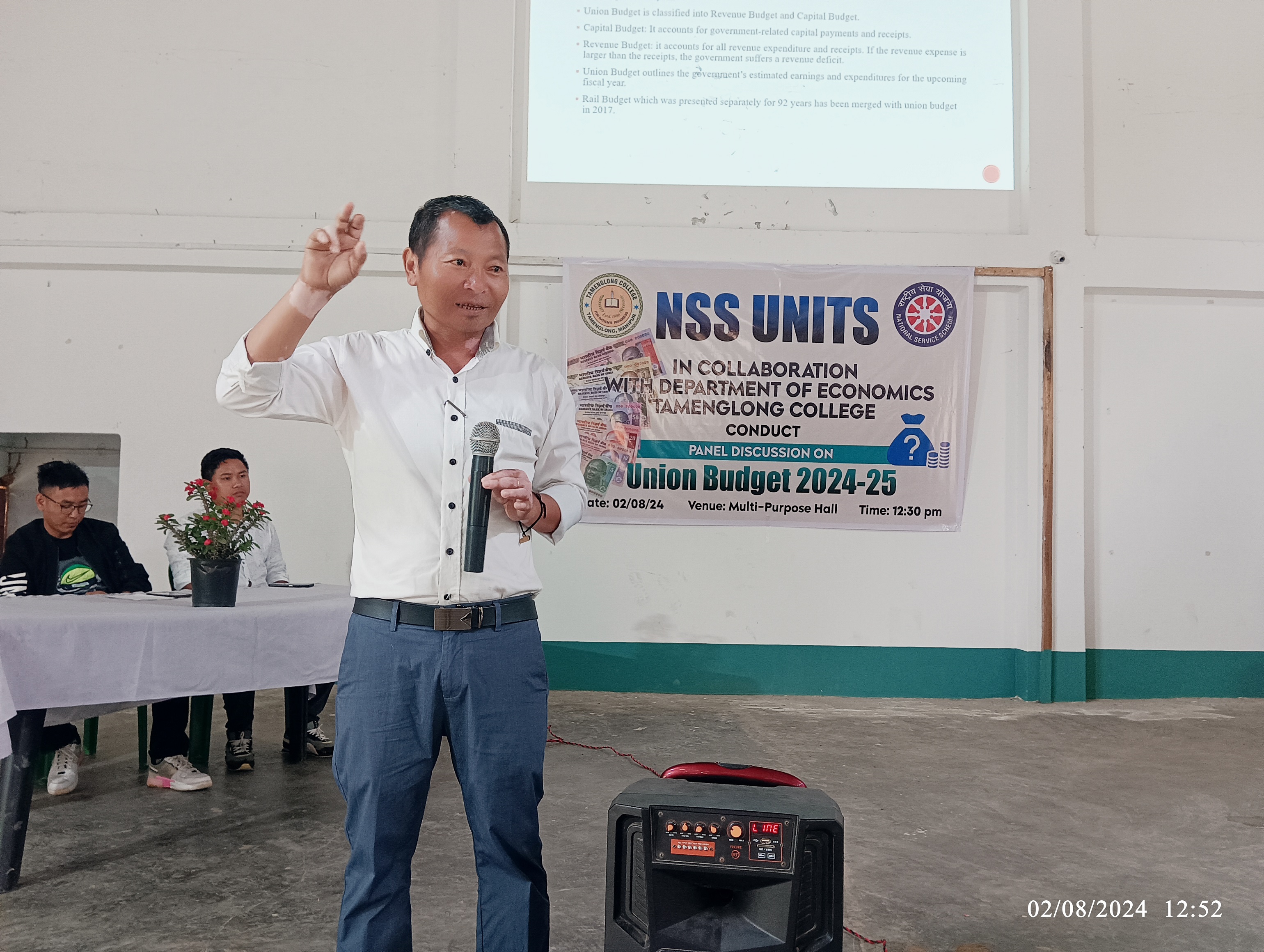 The NSS Unit-1 in collaboration with the Department of Economics, Tamenglong College, organised a One Day Panel Discussion on “Union Budget 2024-25” on 2-8-2024 at 12:30 pm at the Multipurpose Hall of the College.
