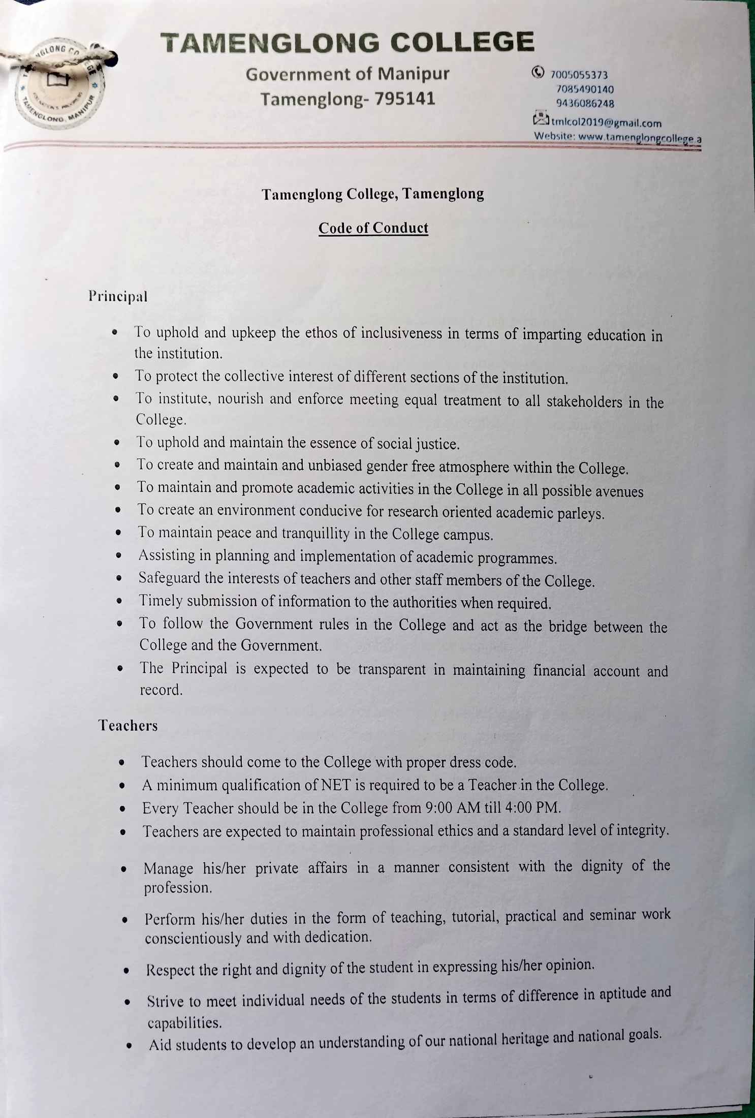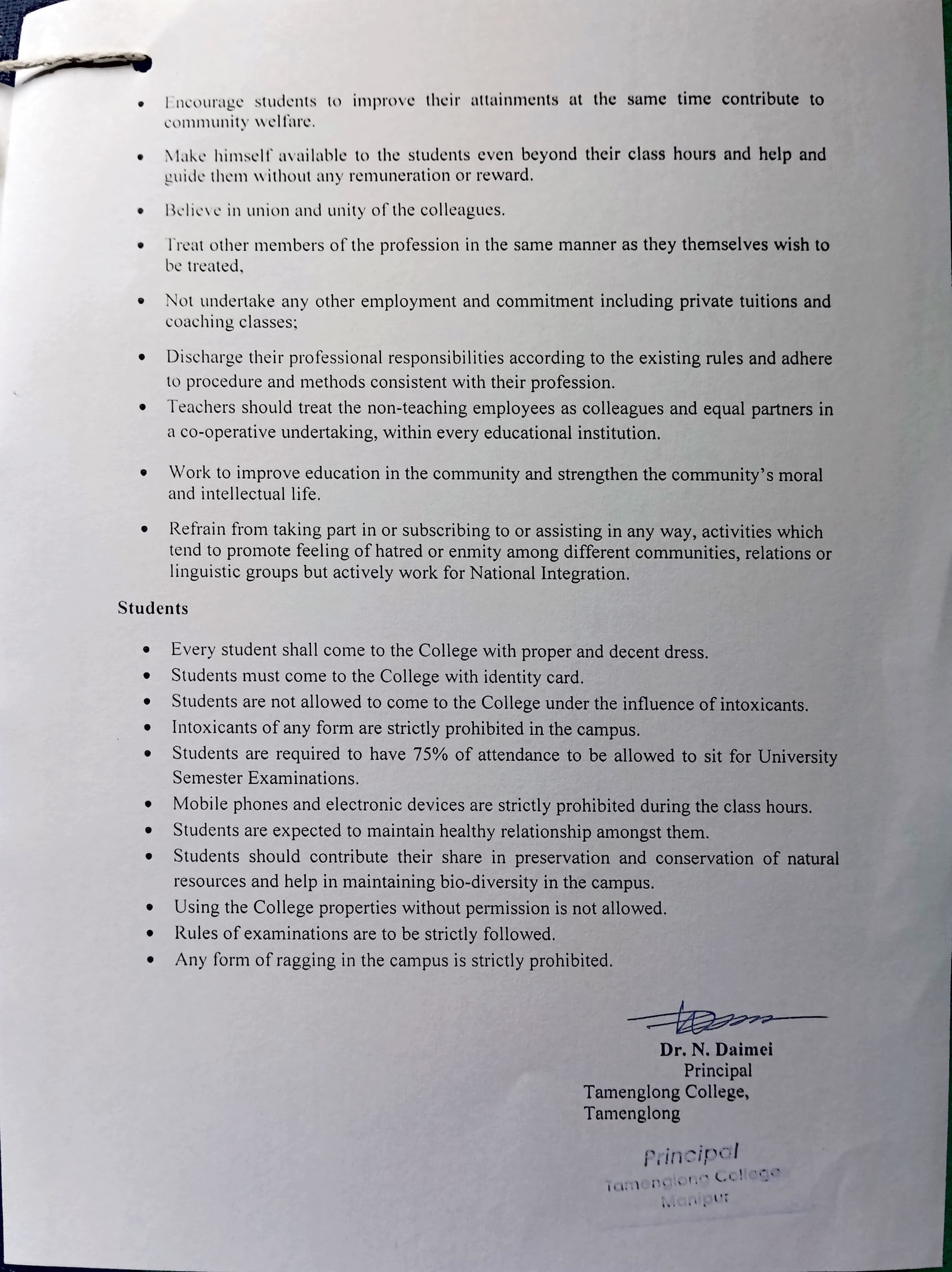 Code of Conduct of Tamenglong College, Tamenglong