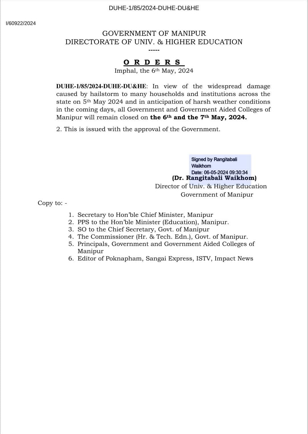 In view of the heavy rainfall accompanied by hailstorms causing damage to many houses and educational institutions, the Government of Manipur ordered the closure of all Government and Government Aided Colleges for two days, i.e. 6-7 May 2024.