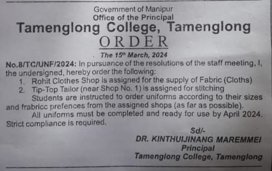As per the staff meeting held on 15 March 2024, the respected Principal hereby authorised ROHIT CLOTHES SHOP, Tamenglong, to supply Fabric (clothes) for College Uniform and TIP-TOP TAILOR (near Shop No.1) for tailoring works.
