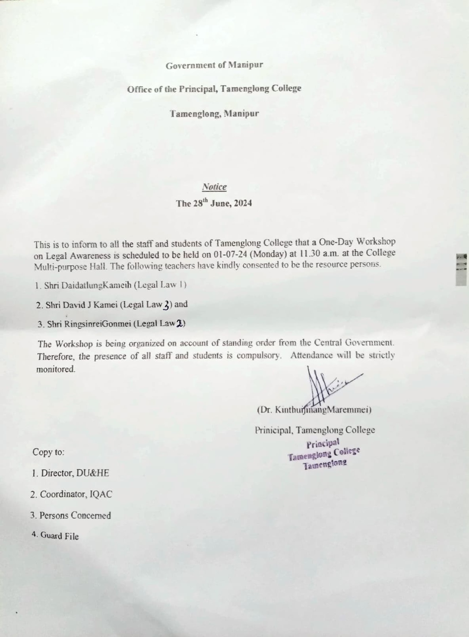 This is to inform to all the staff and students of Tamenglong College that a One-Day Workshop on Legal Awareness is scheduled to be held on 01-07-24 (Monday) at 11.30 am at the College’s Multipurpose Hall.