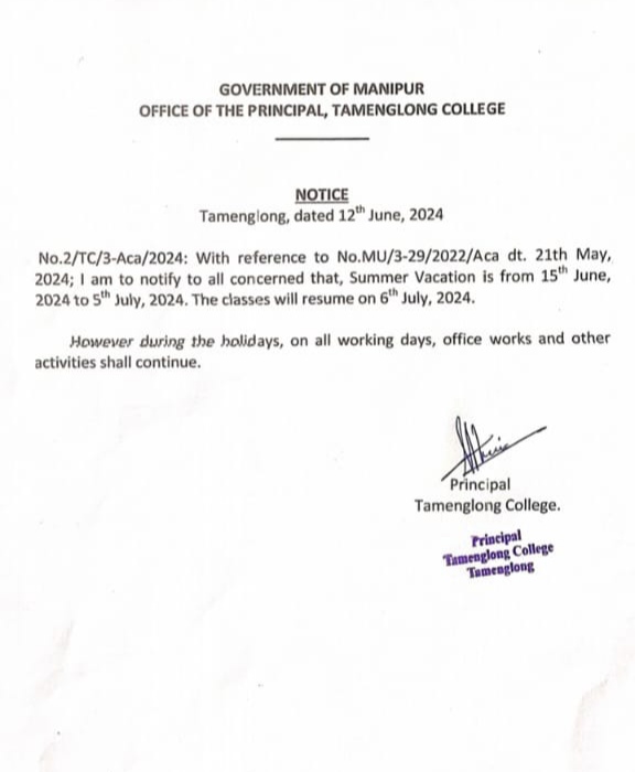 The Principal is pleased to notify to all concerned that, the Summer Vacation is from 15 June, 2024 to 5 July, 2024. The classes will resume on 6th July, 2024. However during the holidays, on all working days, office work and other activities, including University Exams, will continue as usual.